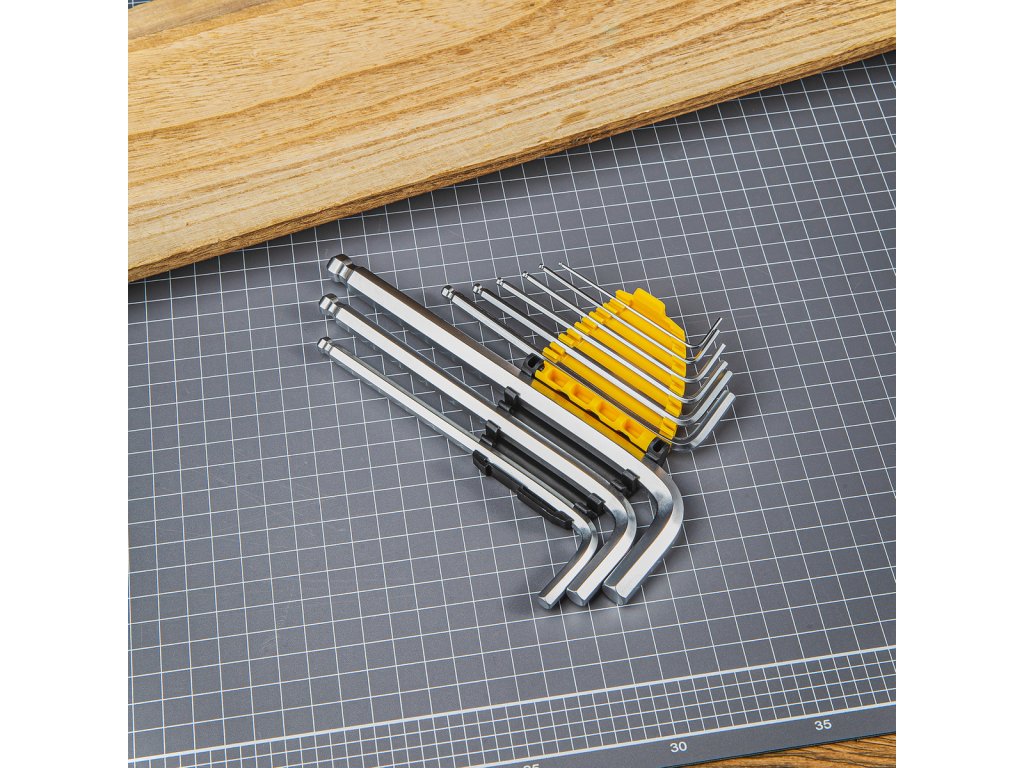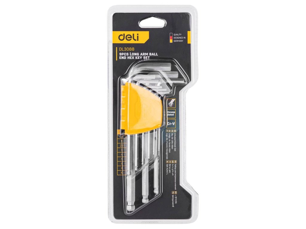 Značková sada Deli Tools se osvědčí v profesionální i v domácí dílně. Balení obsahuje 9 dlouhých chromovaných klíčů vyrobených z materiálu Cr-V. Imbusové klíče jsou navíc na konci zaoblené a mají průměr 1,5-10 mm.